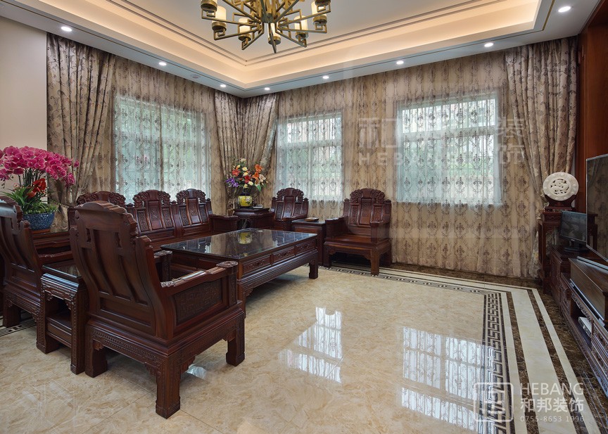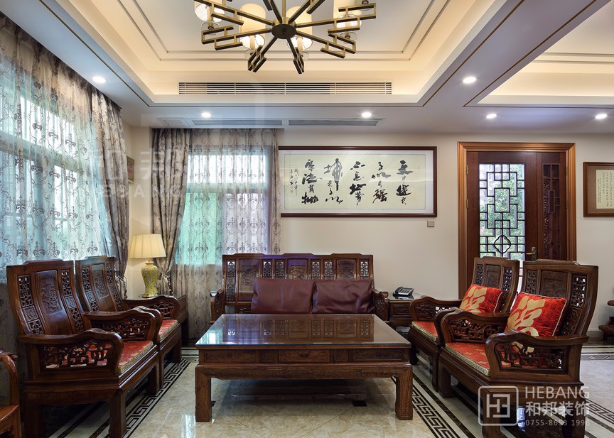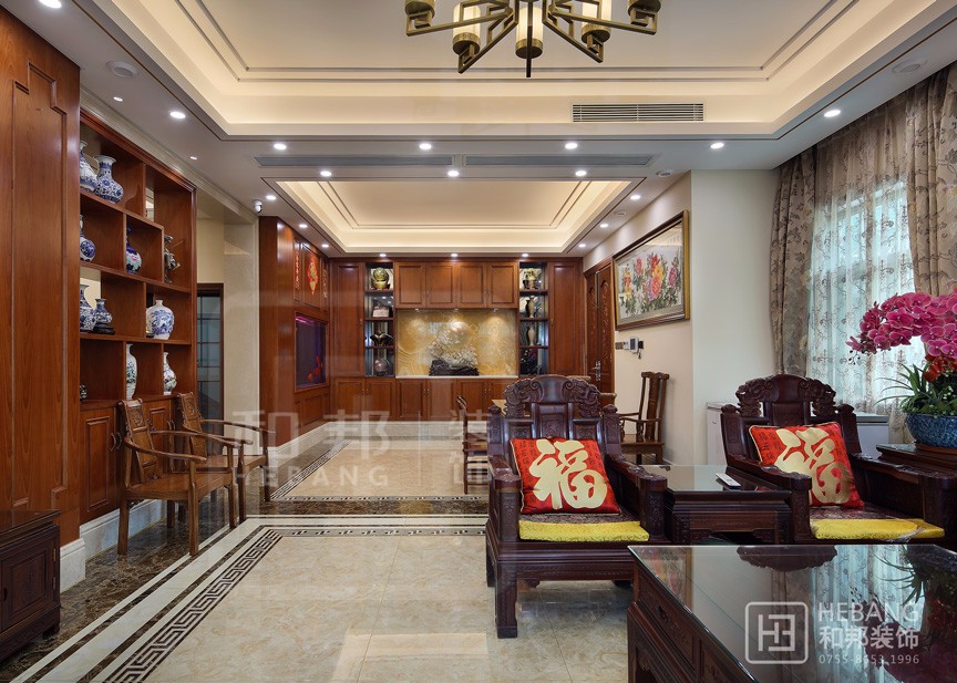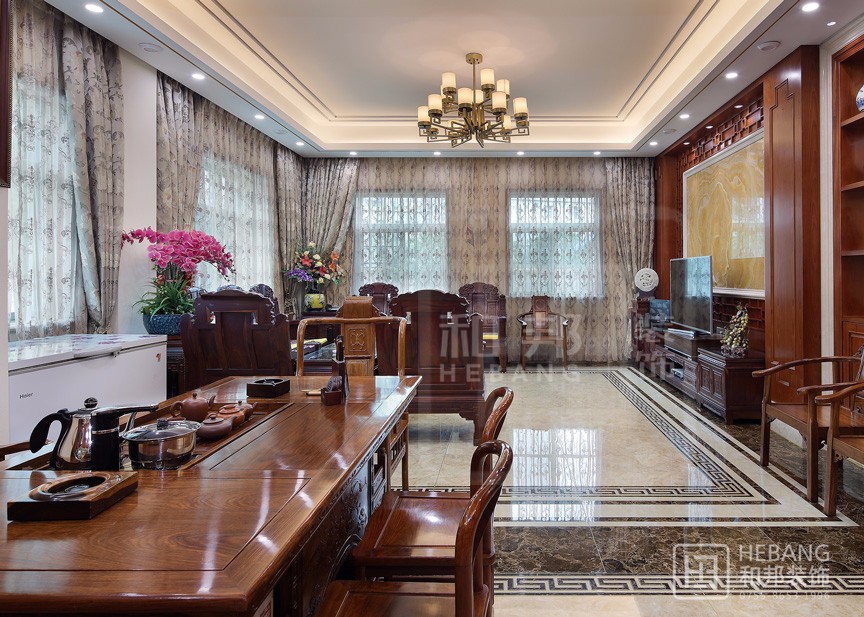 空間內大量運用的木飾面、藤條、石材等天然裝飾材料,以及配合使用的棉麻質地等極具自然情趣的家具在設計師的巧妙運用下打造出了一個靜謐雅致,深富中式的家居空間。