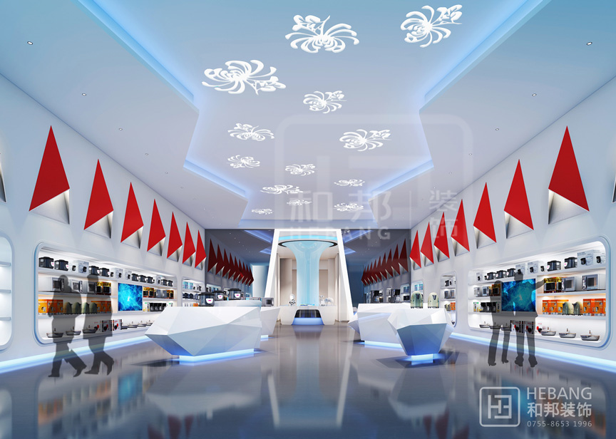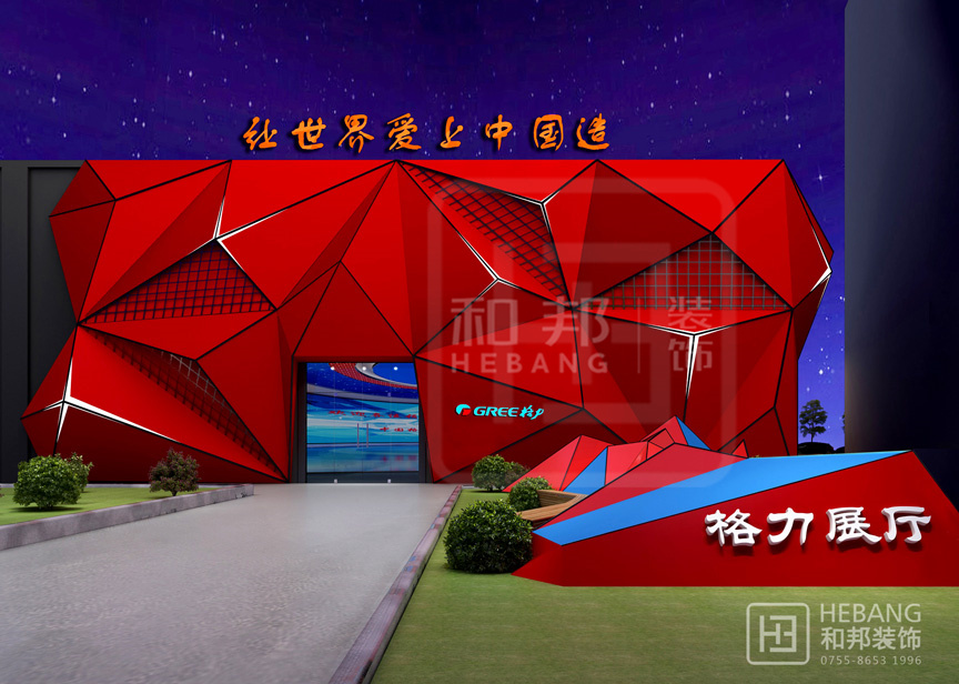 格力集團展廳主體顏色為“中國紅”,整個設計現代感十足。不管是門頭設計采用的立體設計還是內部的各種裝飾元素無不富有設計感。之外,整個展廳的科技感也是十分強的。